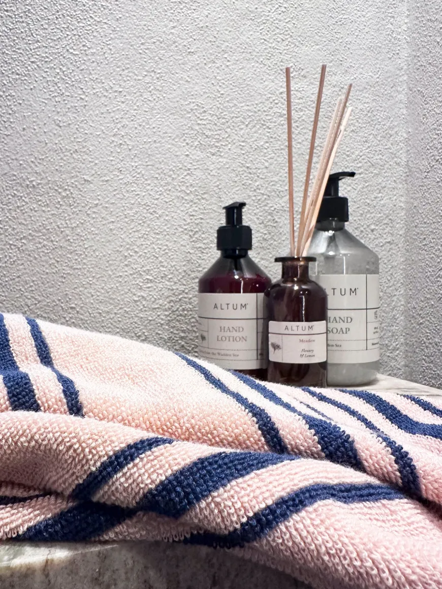 Forkæl dig selv med CALIX håndklædet i den bløde Rose Smoke farve med en elegant blå stribe. Håndklædet måler 50×100 cm og er lavet af 100% bomuld, der sikrer en luksuriøs og behagelig tørreoplevelse. Perfekt til både hverdagsbrug og afslapning.