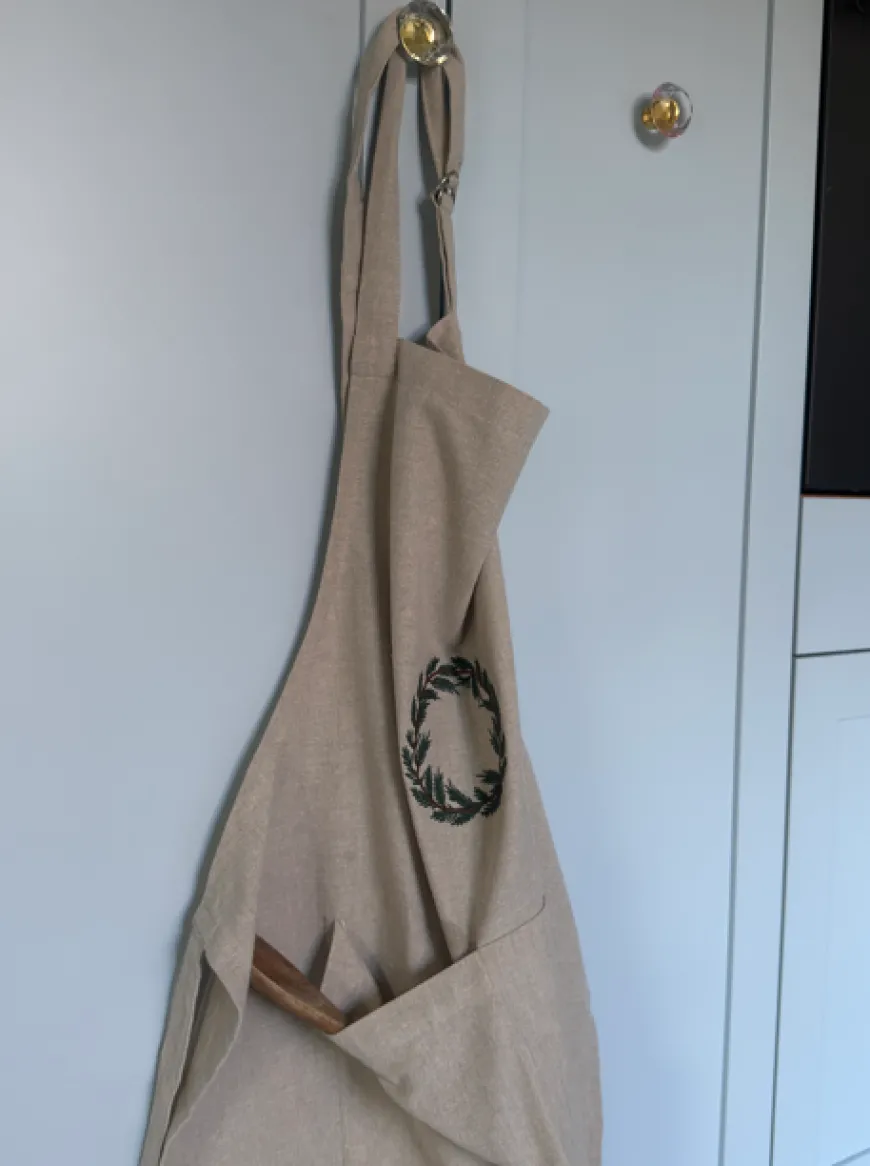 Forklæde med krans broderi (71×125 cm) er en smuk kombination af funktionalitet og julehygge. Det naturlige stof giver et tidløst og rustikt udtryk, mens den broderede grønne krans tilfører et elegant, sæsonpræget præg. Forklædet har en rummelig størrelse, der beskytter tøjet godt under madlavningen, og den praktiske lomme foran giver plads til små køkkenredskaber eller opskrifter. Perfekt til julebagning, madlavning eller som dekorativ detalje i køkkenet, hvor det skaber en varm og hyggelig stemning. Et stilfuldt valg, der kombinerer brugbarhed med klassisk juleæstetik.