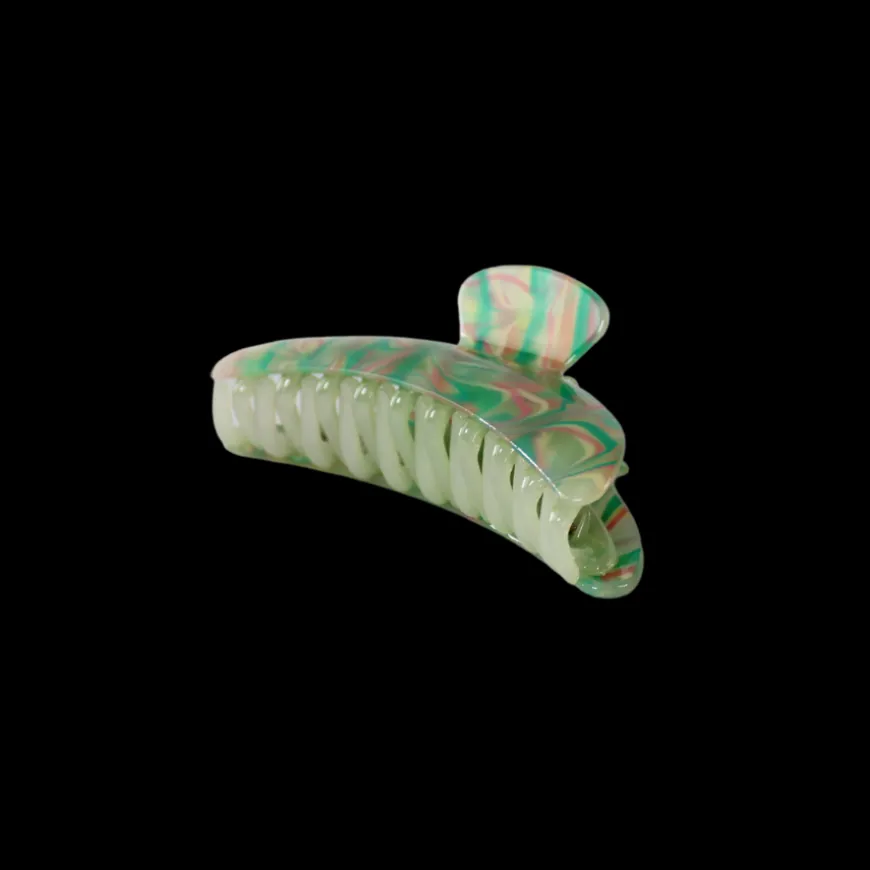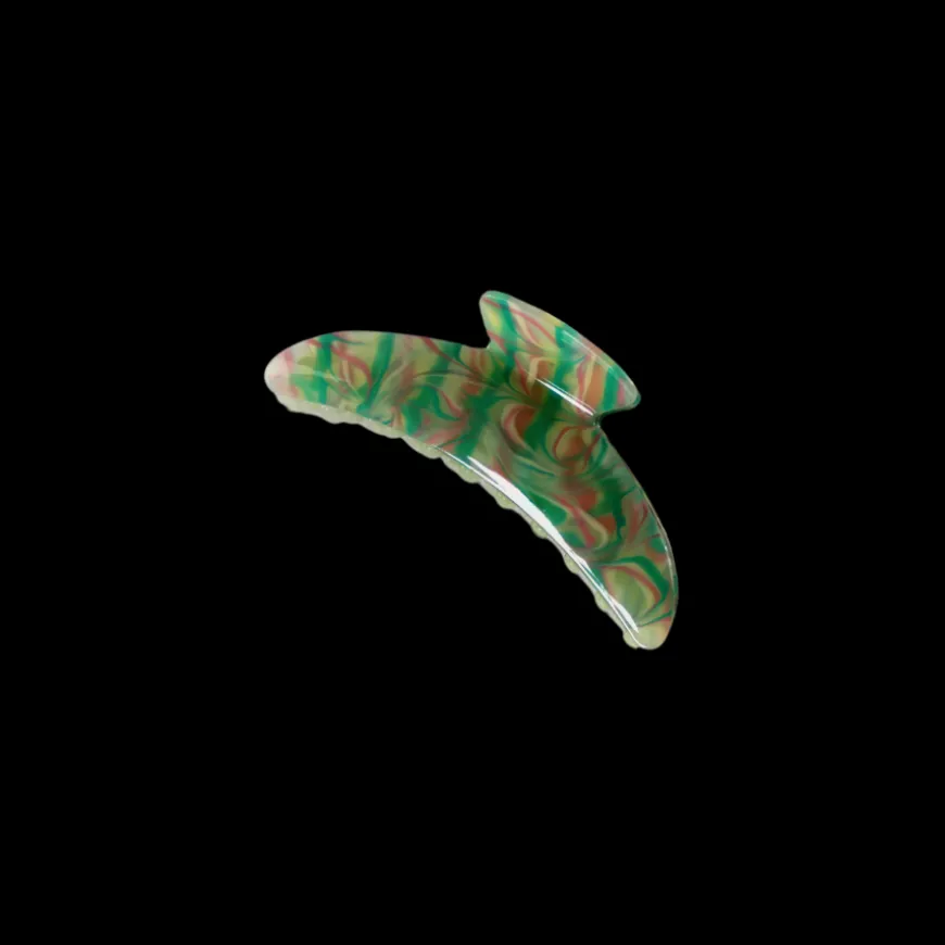 Wilma-hårklemmen skiller sig ud med sit legende mix af grønne og pink nuancer, der giver et friskt og moderne udtryk. Den er designet til at holde håret effektivt på plads, samtidig med at den tilføjer farve og personlighed til din frisure.
