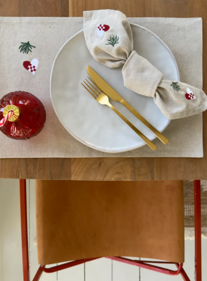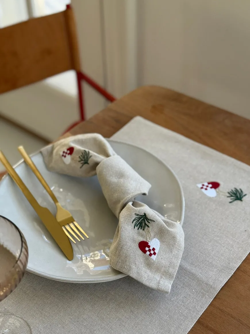 Juledækkeserviet m. Hjerte Broderi (30x45cm) bringer et strejf af klassisk dansk jul til borddækningen. Den naturfarvede tekstil med fint broderet hjerte og grønne grangrene skaber et udtryk, der passer til julemiddage. Den bløde struktur og enkle farve gør den nem at kombinere med både røde, grønne og neutrale nuancer, så du kan skabe din helt egen julestil. En smuk og tidløs dækkeserviet, der forener tradition og enkelthed – ideel til at fuldende julens bord med et elegant udtryk.