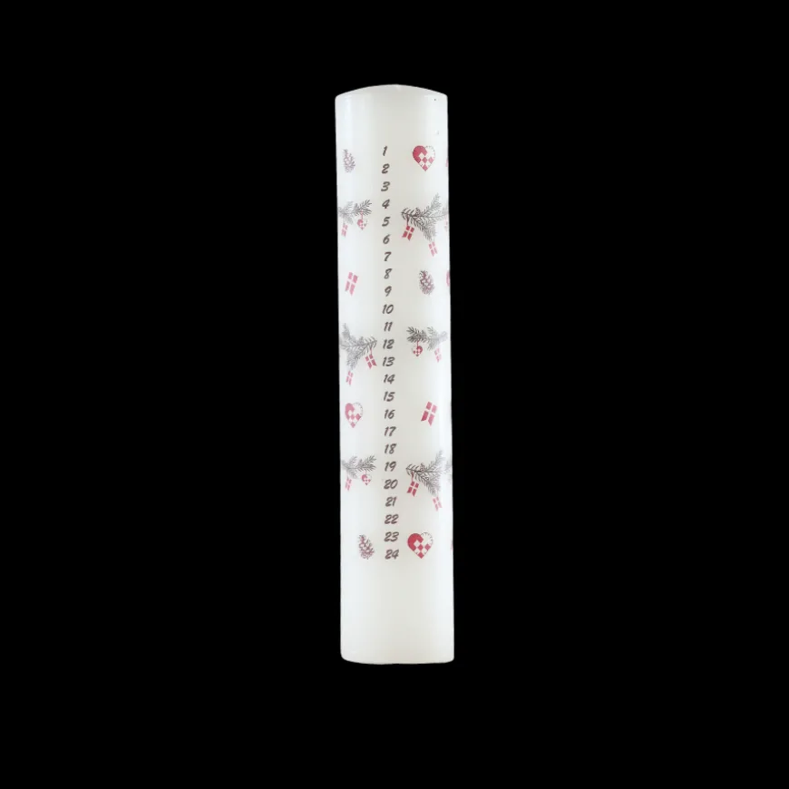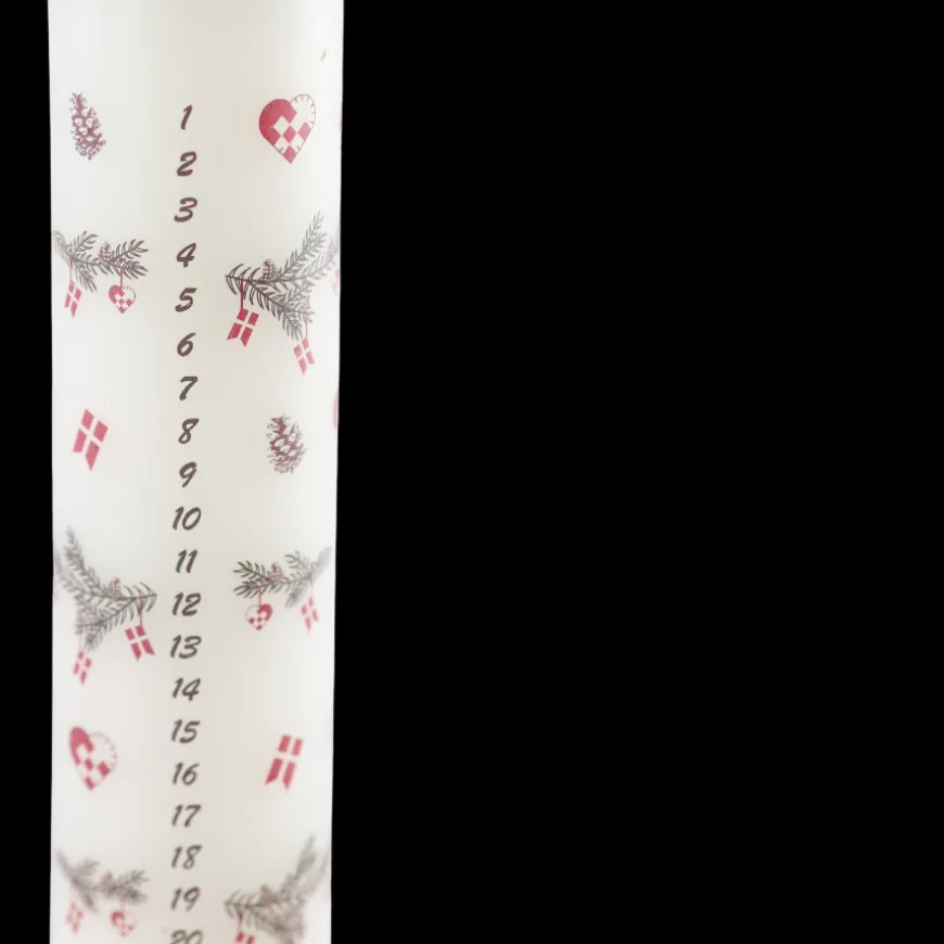 Kalenderlys (25 x 5 cm) er en traditionel juleklassiker, der spreder hygge i december måned. Lyset er udsmykket med røde julemotiver som hjerter, flag, grangrene og kogler, som skaber et varmt og festligt udtryk. Med tal fra 1 til 24 gør det det muligt at tælle ned til juleaften på hyggelig vis. Perfekt til borddekoration, adventshygge eller som en del af den klassiske juleopstilling, hvor det bidrager til den helt rigtige julestemning.