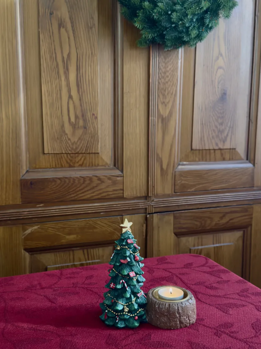 Lysholder juletræ med pynt i polyresin (15 cm) kombinerer funktion og stemning i én dekorativ figur. Det smukke grønne juletræ er udsmykket med røde gaver, kugler, guldkæder og en gylden stjerne på toppen, mens den naturlige træstub fungerer som holder til et fyrfadslys. Når lyset tændes, skabes en varm og hyggelig glød, der fremhæver julens magi. Perfekt til spisebordet, vindueskarmen eller som en del af en dekorativ juleopstilling.
