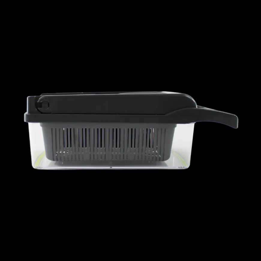 Dette mandolinjern med opsamlingsbeholder er en praktisk og alsidig køkkenhjælper med otte funktioner, der gør det nemt at skære, rive, lave julienne og skære i tern. Med en kapacitet på 1,2 liter holder opsamlingsbeholderen køkkenbordet rent og organiseret under madlavningen.