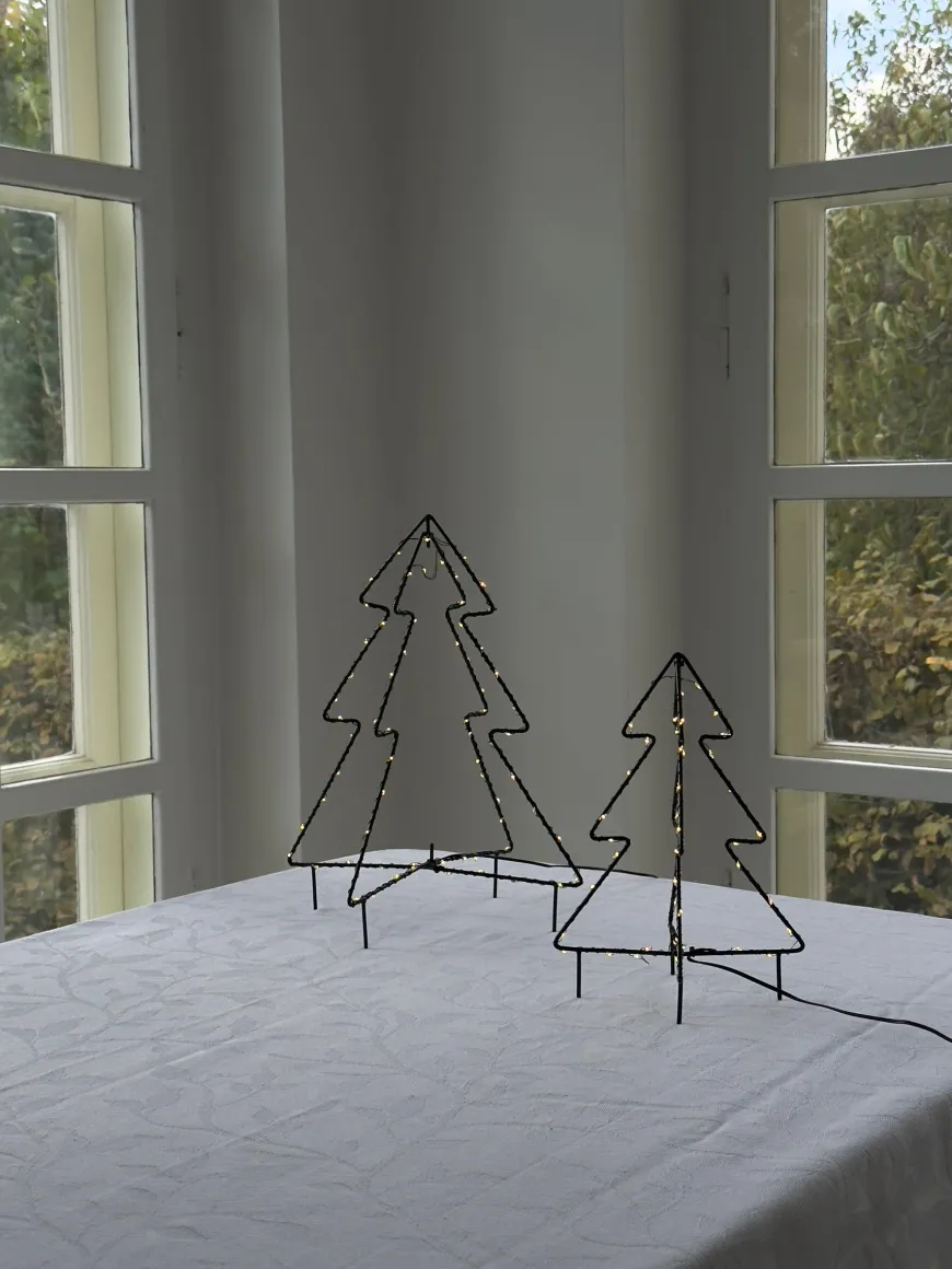 Metal juletræ med 50 LED-lys (H25 cm) er en hyggelig og dekorativ julebelysning, der skaber en varm stemning både indendørs og udendørs. Den minimalistiske trækonstruktion i metal giver et moderne udtryk, mens de små LED-lys fordelt på rammen spreder et blødt og indbydende skær. Med den praktiske timerfunktion kan juletræet indstilles til at lyse i 6 timer og derefter slukke automatisk i 18 timer, så du slipper for daglig betjening.