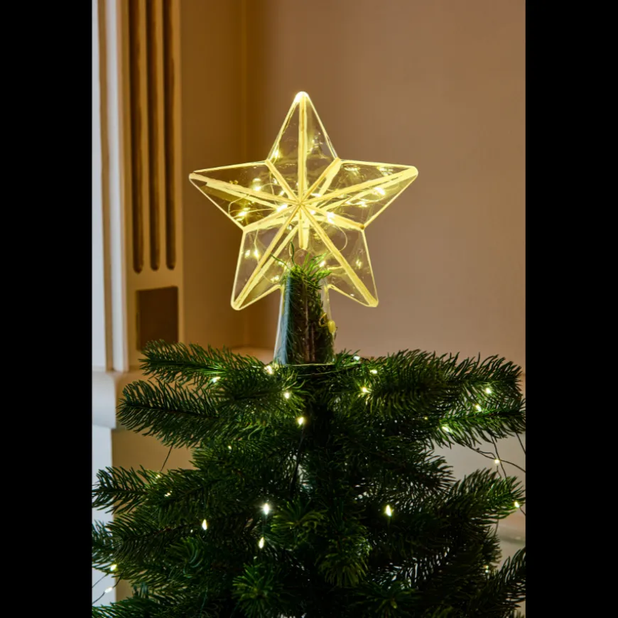 Sirius Agnes juletræsstjerne er en smuk og moderne toppynt, der fuldender juletræets udtryk med et elegant lysende touch. Den klare stjerne er udstyret med 20 små LED-lys, som spreder en varm og stemningsfuld glød, der fremhæver træets pynt og giver rummet en hyggelig atmosfære. Med sit enkle design passer stjernen perfekt til både klassiske og moderne juletræer, og den er nem at montere på toppen. Et tidløst valg, der kombinerer tradition og moderne belysning.