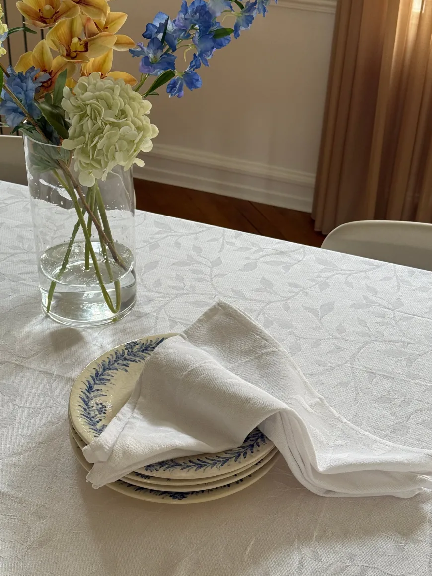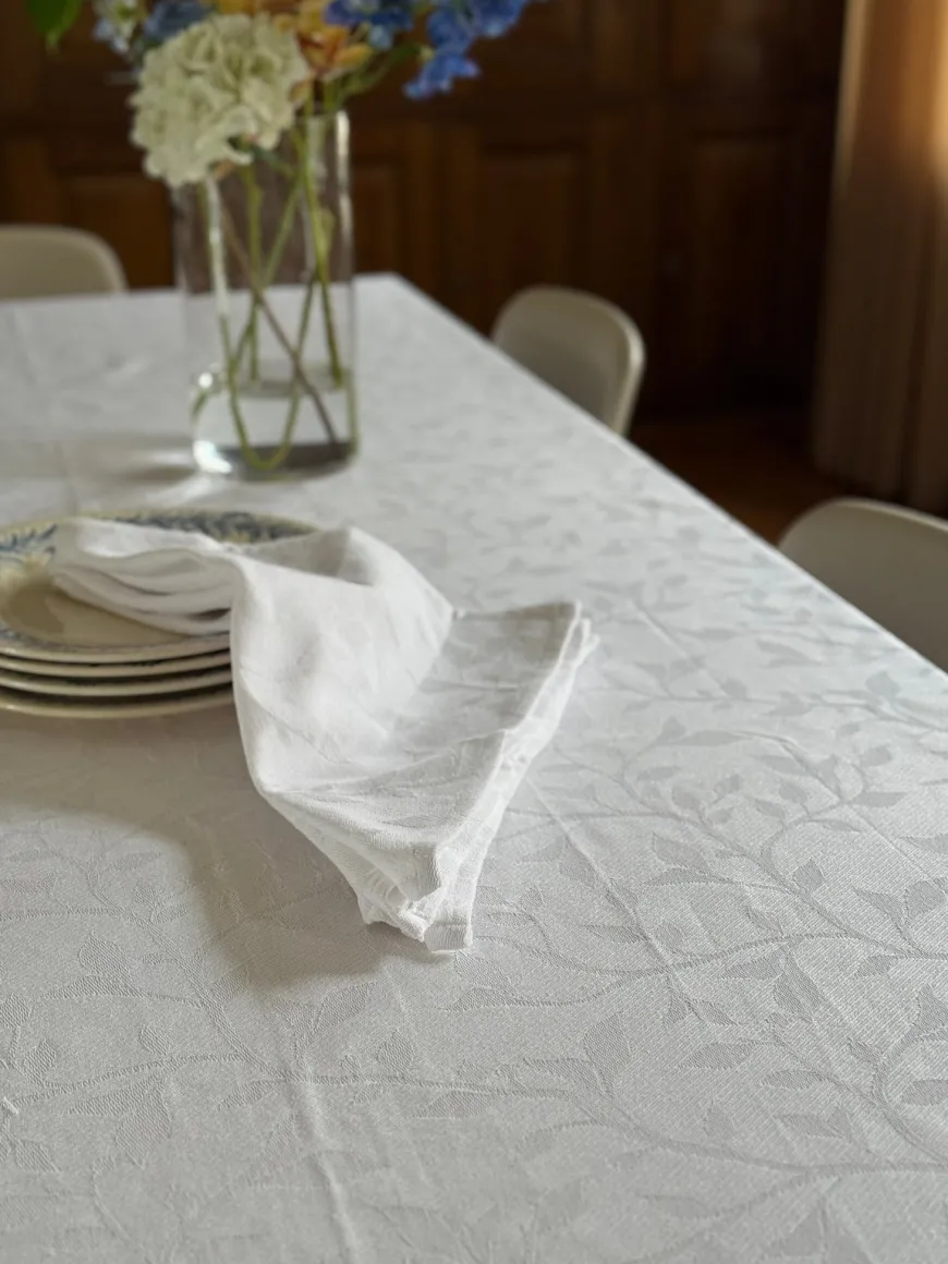 Tilføj et strejf af klassisk elegance til borddækningen med Mundserviet METTE i Jacquard. Den rene hvide farve og det smukke jacquardvævede mønster giver et raffineret udtryk, der passer perfekt til både festlige lejligheder og stilfuld hverdagsbrug.