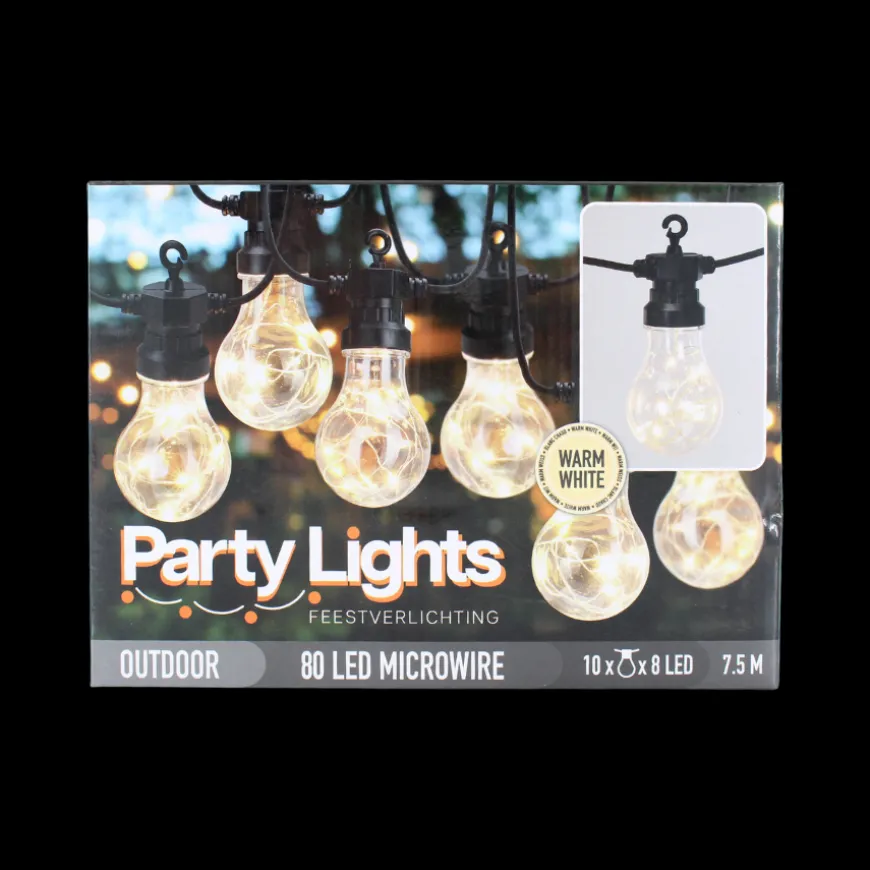 Denne LED lyskæde er specielt designet til udendørsbrug og strækker sig over 7,5 meter. Med sin længde kan du nemt dække større områder og skabe en smuk belysning udendørs. Den varme hvide belysning tilføjer en hyggelig atmosfære til din have, terrasse eller altan, og lyskæden er perfekt til at skabe en magisk stemning ved udendørsarrangementer eller fester. Lyskæden har 10 pærer med 8 små LED lys i hver.
