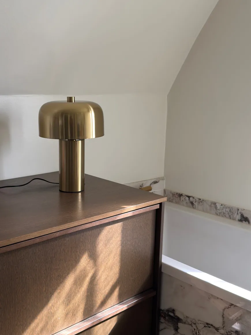 Bordlampe Macy i messinglook tilfører et elegant og varmt skær til ethvert rum. Den klassiske silhuet kombineret med den moderne messingfinish gør den let at integrere i forskellige indretningsstile. Placer den på et sidebord i stuen, på natbordet i soveværelset eller på skrivebordet for et stilfuldt og funktionelt lys. Lampen skaber en behagelig atmosfære og er et smukt element i indretningen.Bordlampen er designet med fokus på både æstetik og funktionalitet. Den giver et godt lys til læsning eller hygge, og dens tidløse design sikrer, at den vil være en favorit i mange år fremover.