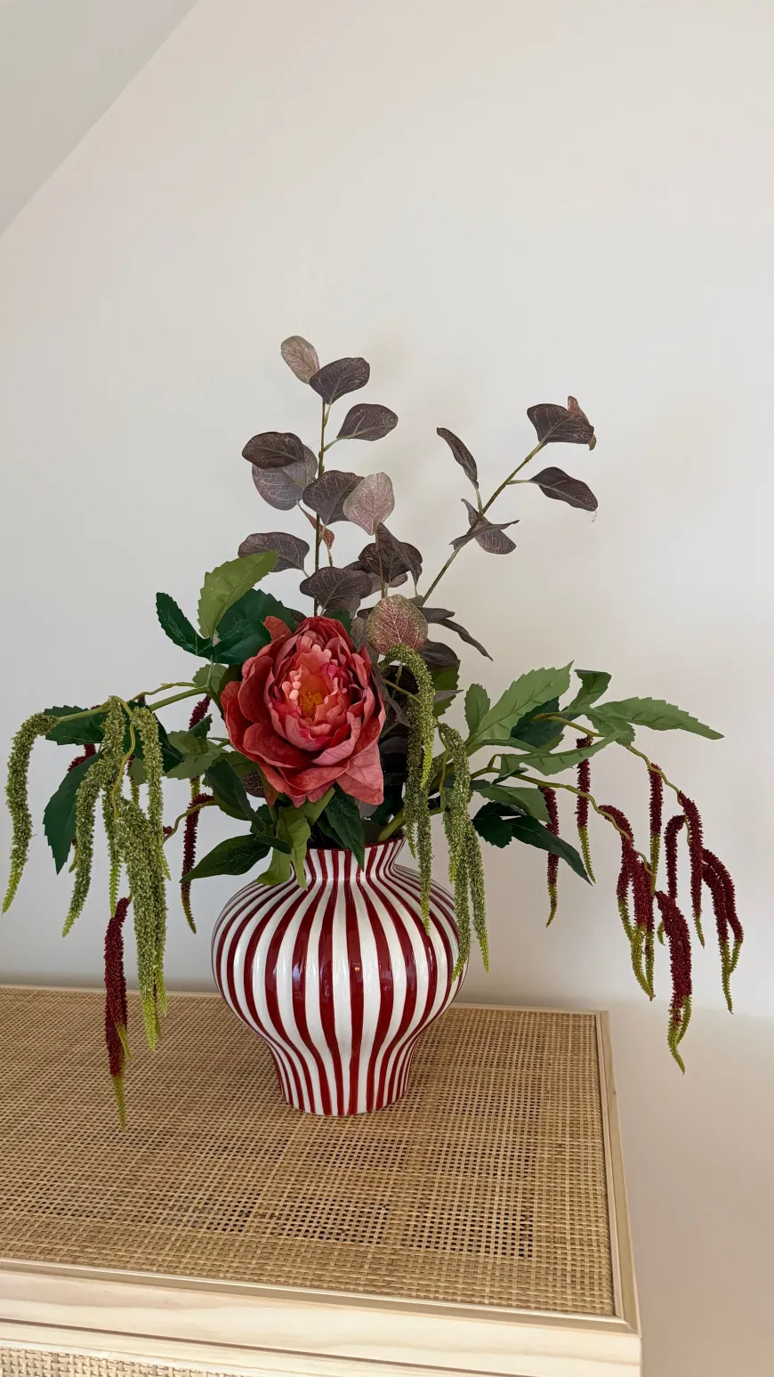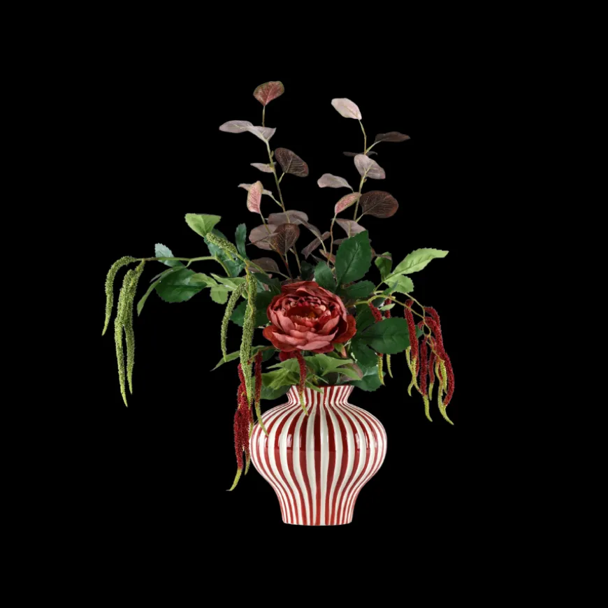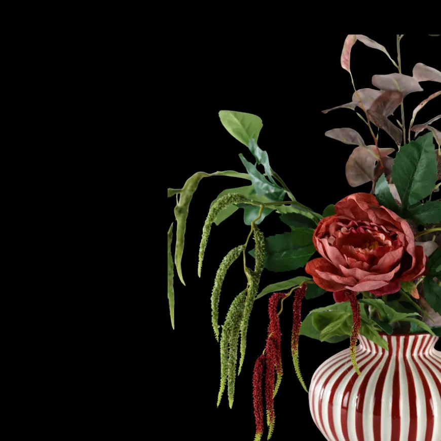 Evighedsbuket Efterårsglød m. Pæon og Røde Detaljer bringer et varmt udtryk ind i hjemmet. Den røde pæon står som bukettens midtpunkt, mens de brunlige eucalyptusgrene og røde græsstrå tilfører et efterårsagtigt præg. De grønne nuancer giver liv og balance, så buketten fremstår luksuriøs og harmonisk. Et smukt valg til spisebordet eller stuen, der holder sin form og farve år efter år.