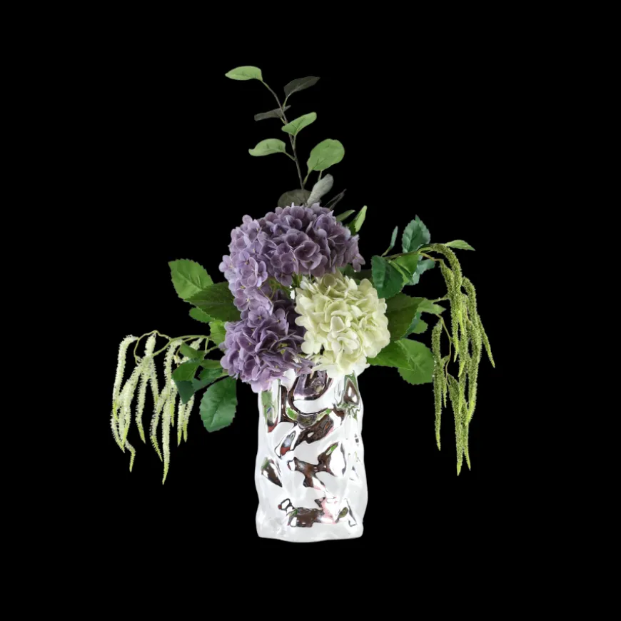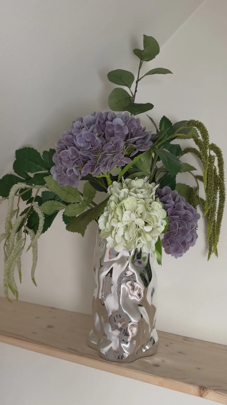 Evighedsbuket Lilla Drøm m. Hortensia og Eucalyptus udstråler ro, elegance og skønhed. De frodige hortensiaer i nuancer af lilla og hvid skaber et harmonisk farvespil, mens de grønne græsstrå og eucalyptusgrene tilfører friskhed og lethed. Buketten passer smukt ind i moderne og klassiske hjem og tilføjer et strejf af farve, som holder hele året – uden behov for vanding eller pleje.