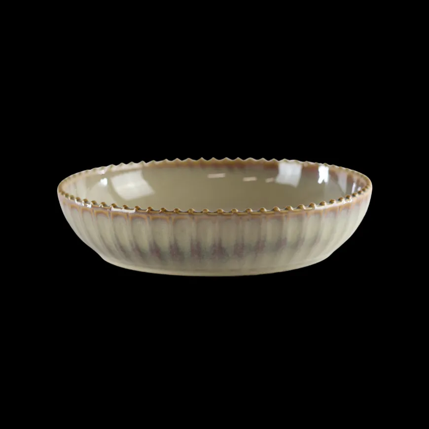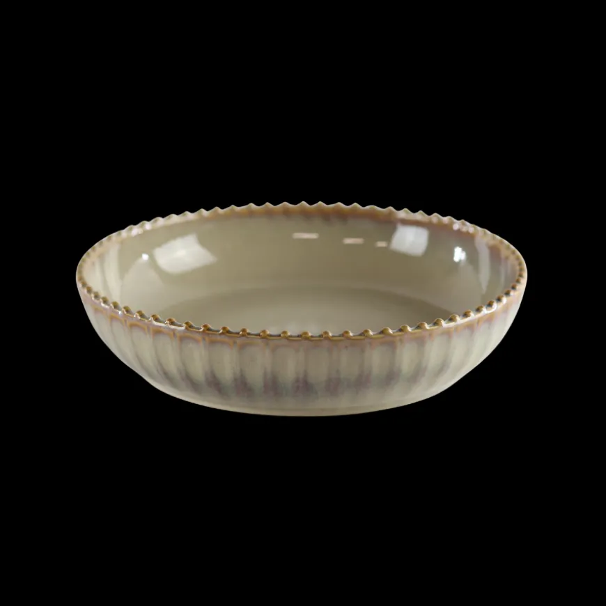 Serveringsskål FALLON i reaktiv beige bringer en elegant nuance til borddækningen. Skålen har en smuk, glansfuld overflade med håndlavet udtryk, hvor glasuren giver et unikt farvespil. Den fine bølgede kant og bløde form gør den perfekt til servering af salater, pasta eller frugt, samtidig med at den pynter smukt på bordet.