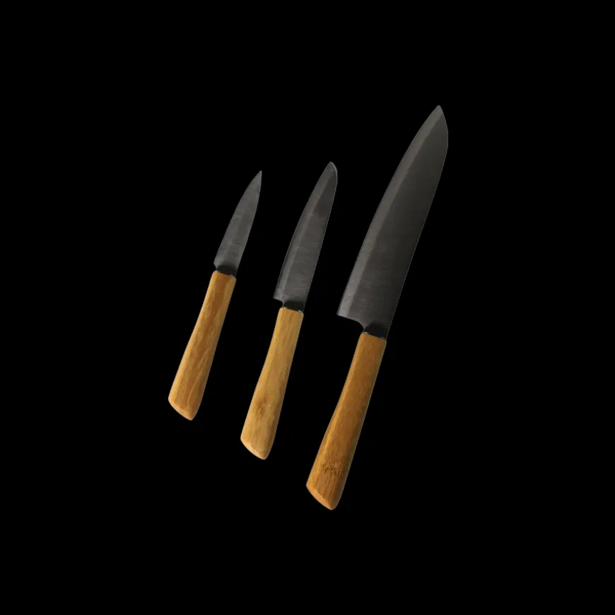 Knivene er udstyret med skarpe blade i rustfrit stål og ergonomiske træskafter, der giver et behageligt greb og præcis kontrol. Skærebrættet har en praktisk safrille, som opsamler væske, så dit køkkenbord holdes rent under arbejdet.