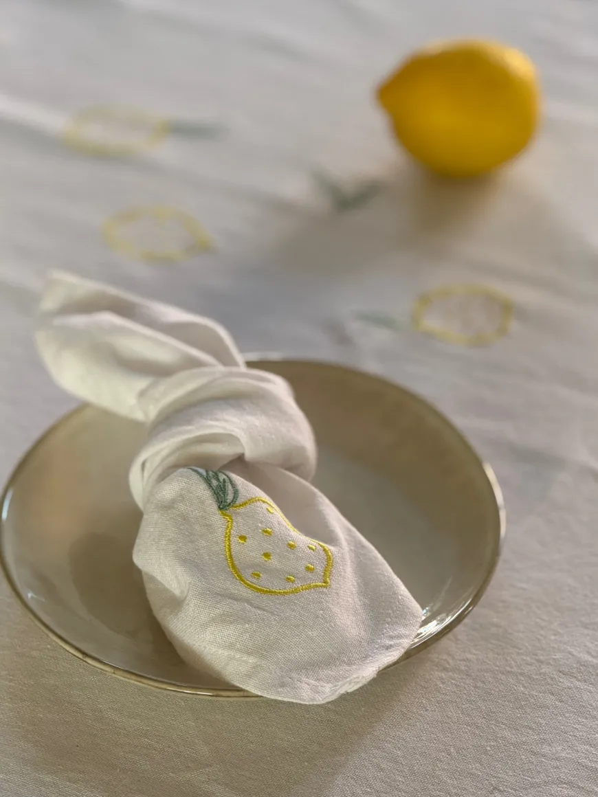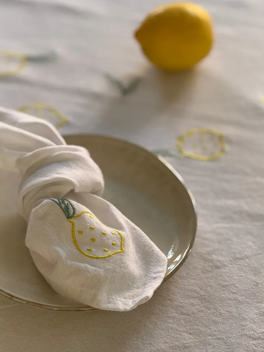 Den bløde og holdbare kvalitet gør servietten både funktionel og dekorativ, mens citronmønsteret giver en frisk og sommerlig stemning. Den lette tekstur gør servietten behagelig at bruge, og den kan nemt vaskes og bruges igen.