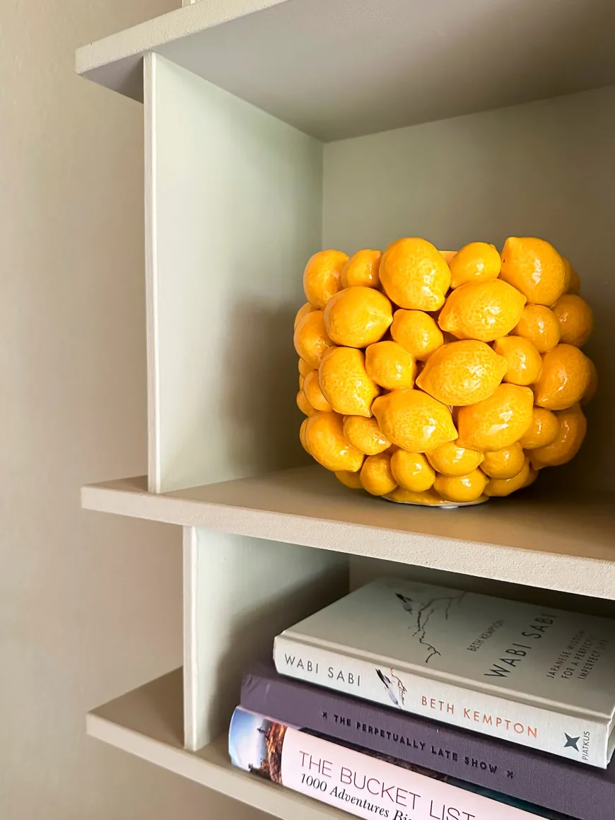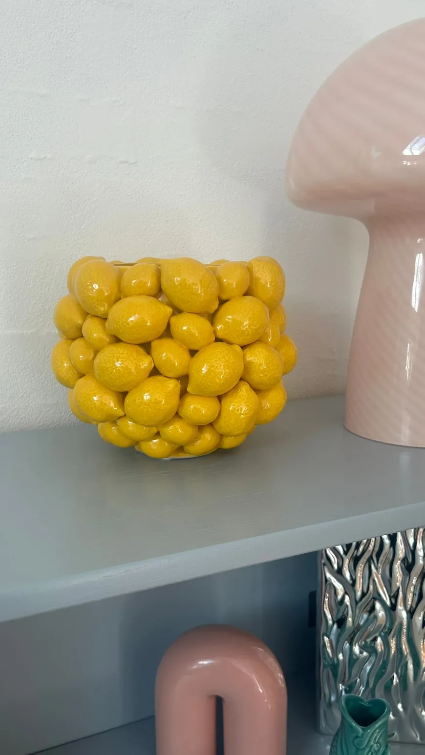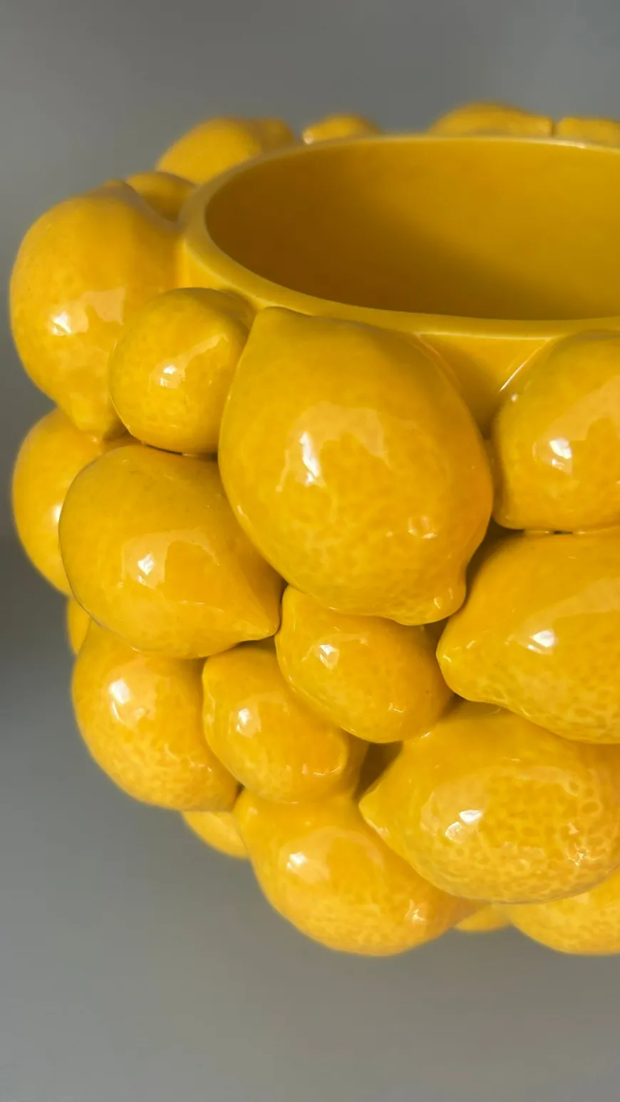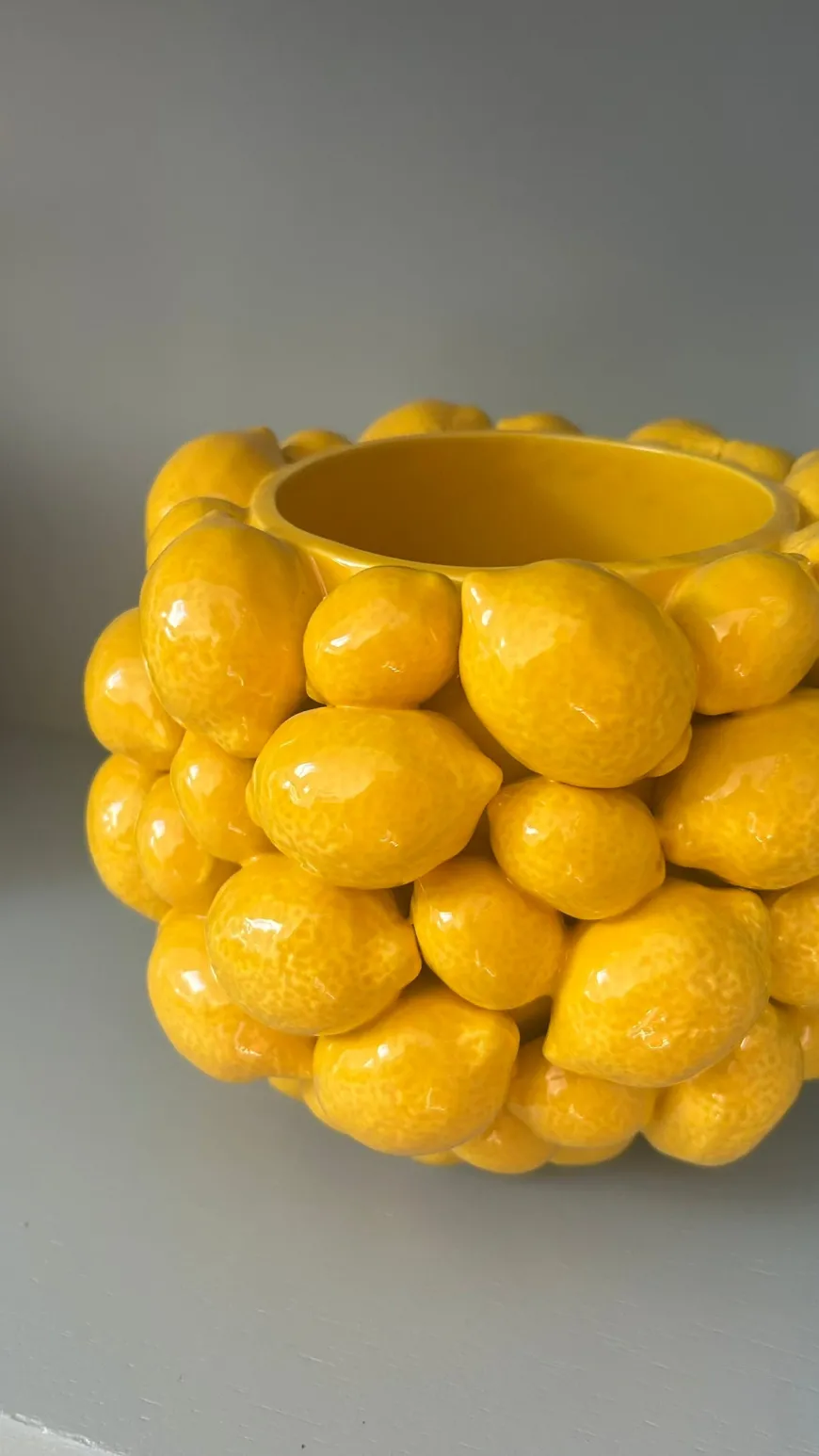 Tilføj et solskinsgult strejf til dit hjem med denne charmerende keramik vase. Det dekorative citronmotiv bringer et friskt og levende udtryk til ethvert rum. Vasens form og farve gør den til et iøjnefaldende element, der nemt kan kombineres med forskellige indretningsstile. Perfekt til at fremvise dine yndlingsblomster eller som et dekorativt objekt i sig selv. Denne vase vil uden tvivl bringe glæde og personlighed ind i dit hjem.