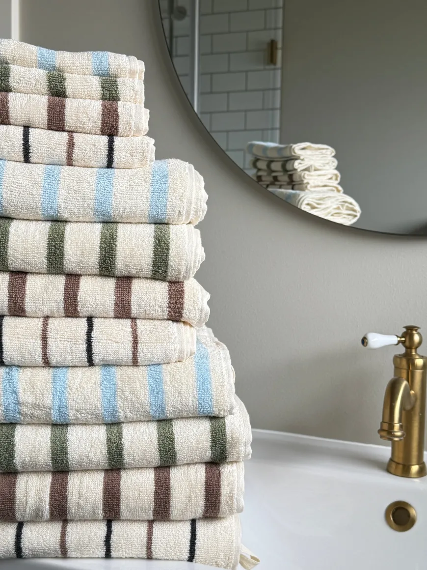 Denne vaskeklud med striber i creme, grå og brun er lavet af 100% bomuld, hvilket gør den blødt, absorberende og behageligt mod huden. Med målene 30×30 cm har det en ideel størrelse til både badeværelse og spa.
